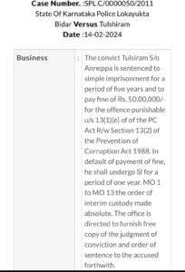 ತುಳಸಿರಾಮ ಅಣ್ಣೆಪ್ಪ ನಂದಗಾಂವೆ ಶಿಕ್ಷೆಗೆ ಒಳಗಾದವರು. ಇವರು ಮಾಜಿ ಸಚಿವ ಬಂಡೆಪ್ಪ ಕಾಶಂಪೂರ್ ಅವರ ಆಪ್ತ ಕಾರ್ಯದರ್ಶಿಯಾಗಿ ಹಲವು ವರ್ಷ ಸೇವೆ ಸಲ್ಲಿಸಿದ್ದರು. ಪ್ರಕಣದ ವಿಚಾರಣೆ ನಡೆಸಿದ ನ್ಯಾಯಾಧೀಶ ವಿಜಯಕುಮಾರ ಎಂ. ಆನಂದಶೆಟ್ಟಿ, ಲಂಚ ನಿಷೇಧ ಕಾಯ್ದೆಯ ಅನ್ವಯ ಬುಧವಾರ ಜೈಲು ಶಿಕ್ಷೆ ಹಾಗೂ ದಂಡ ವಿಧಿಸಿದ್ದಾರೆ. ದಂಡ ಭರಿಸಲು ತಪ್ಪಿದ್ದಲ್ಲಿ ಹೆಚ್ಚುವರಿಯಾಗಿ ಒಂದು ವರ್ಷ ಶಿಕ್ಷೆ ವಿಧಿಸಿ ಆದೇಶ…