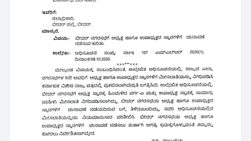 ಬೀದರ್: ನಗರಸಭೆ ಅಧ್ಯಕ್ಷ, ಉಪಾಧ್ಯಕ್ಷ ಸ್ಥಾನಗಳ ಮೀಸಲಾತಿ ನಿಗದಿಪಡಿಸಿ ನಗರಾಭಿವೃದ್ಧಿ ಇಲಾಖೆಯ ಕಾರ್ಯದರ್ಶಿ ನಗರಸಭೆಗೆ ಚುನಾವಣೆ ನಡೆಸುವಂತೆ ಜಿಲ್ಲಾಧಿಕಾರಿಗೆ ಸಪ್ಟೆಂಬರ್ 17ರಂದು ನಿರ್ದೇಶನ ನೀಡಿದ್ದಾರೆ.