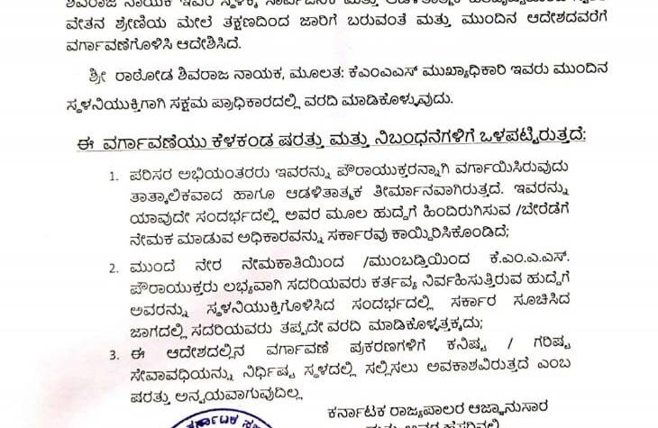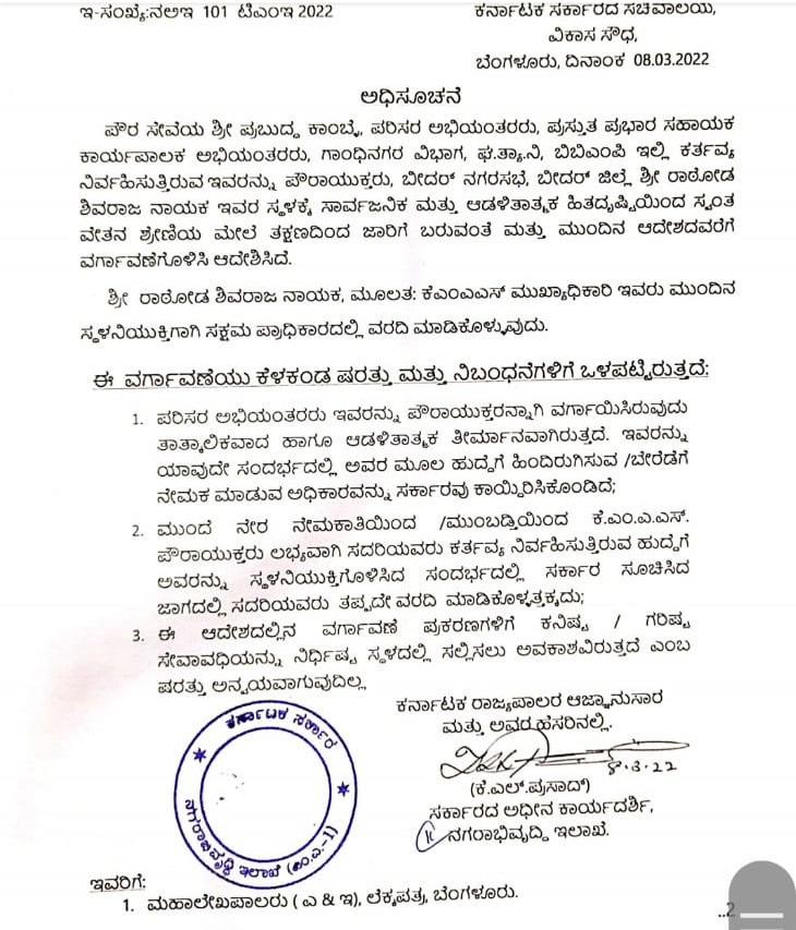 ದಿನಾಂಕ: 02-03-2022ರಂದು ಬೀದರ ನಗರ ಸಭೆ ಆಯ್ತರಾಗಿ ಆದೇಶ ಬಂದಿತ್ತು. ಅಧಿಕಾರ ಸ್ವೀಕರಿಸಿದ ಮೂರುದಿನಗಳಲ್ಲಿಯೇ ದಿನಾಂಕ 08-03-2022ರಂದು ಪರಿಸರ ಅಭಿಯಂತರರಾದ ಪ್ರಬುದ್ದ ಕಾಂಬ್ಳೆ ಅವರನ್ನು ನೂತನ ಪ್ರಭಾರ ಆಯುಕ್ತರಾಗಿ ನೇಮಕಗೊಳ್ಳಿಸಿ ಸರ್ಕಾರದ ಅಧೀನ ಕಾರ್ಯದರ್ಶಿ ಕೆ.ಎಲ್.ಪ್ರಸಾದ್ ವರ್ಗಾವಣೆ ಆದೇಶ ಹೊರಡಿಸಿದ್ದಾರೆ. ವಾರದಲ್ಲಿಯೇ ಉನ್ನತ ಹುದ್ದೆಯಲ್ಲಿರುವ ಅಧಿಕಾರಿಗಳ ವರ್ಗಾವಣೆಗೊಂಡರೆ ಏನು ಗತಿ? ಎಂದು ಅಧಿಕಾರಿಗಳು ಮಾತಾಡಿಕೊಳ್ಳುತ್ತಿದ್ದಾರೆ.
