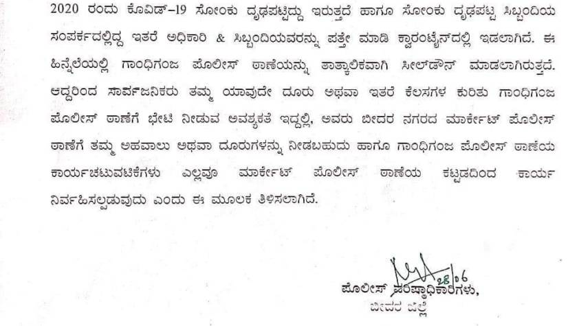 ಮುಂದಿನ ಆದೇಶದ ವರೆಗೂ ಗಾಂಧಿ ಗಂಜ್ ಠಾಣೆಯ ಎಲ್ಲ ಕಾರ್ಯ ಚಟುವಟಿಕೆಗಳನ್ನು ನಗರದ ಮಾರ್ಕೆಟ್ ಪೊಲೀಸ್ ಠಾಣೆಯ ಪ್ರಾಂಗಣದಲ್ಲಿ ನೞೆಯಲ್ಲಿದ್ದು, ಸಾರ್ವಜನಿಕರು ಯಾವುದೇ ದೂರು, ಅಹವಾಲುಗಳನ್ನು ಅಲ್ಲಿಗೆ ಸಲ್ಲಿಸಬಹುದು ಎಂದು ಪ್ರಕಟಣೆಯಲ್ಲಿ ತಿಳಿಸಿದ್ದಾರೆ. ಸಿಬ್ಬಂದಿಗೆ ಪಾಸಿಟಿವ್ ಬಂದಿರುವ ಹಿನ್ನೆಲೆ ಇತರೆ ಸಿಬ್ಬಂದಿಗಳು ಕೂಡ ಆತಂಕ ಪಡುವಂತಾಗಿದೆ.