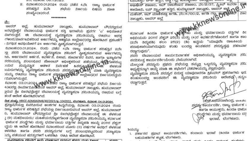 ಹುಮನಾಬಾದ: ಪಟ್ಟಣದ ವೀರಭದ್ರೇಶ್ವರ ದೇವಸ್ಥಾನದ ವ್ಯವಸ್ಥಾಪಕ ಸಮಿತಿಯ 9 ಜನ ಸದಸ್ಯರ ಸಮಿತಿ ರಚಿಸಿ ರಾಜ್ಯ ಧಾರ್ಮಿಕ ಪರಿಷತ್ತು ಹಾಗೂ ಆಯುಕ್ತರು, ಹಿಂದೂ ಧಾರ್ಮಿಕ `ಸಂಸ್ಥೆಗಳು ಮತ್ತು ಧರ್ಮಾದಾಯ ದತ್ತಿಗಳಯ ಸದಸ್ಯ ಕಾರ್ಯದರ್ಶಿಯಾದ ಹೆಚ್.ಬಸವರಾಜೇಂದ್ರ ಆದೇಶ ಹೊರಡಿಸಿದ್ದಾರೆ.
