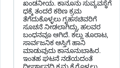 ರಾಯಣ ಪ್ರತಿಮೆಗೆ ಭಗ್ನ : ಪುಂಡರ ವಿರುದ್ಧ ಕಠಿಣ ಕ್ರಮಕ್ಕೆ ಗೃಹ ಸಚಿವರ ಆದೇಶ ಬೆಂಗಳೂರು, ಡಿಸೆಂಬರ್ 19: ಬೆಳಗಾವಿಯಲ್ಲಿ ಕ್ರಾಂತಿವೀರ ಸಂಗೊಳ್ಳಿ ರಾಯಣ್ಣ ಅವರ ಪ್ರತಿಮೆ ಭಗ್ನಗೊಳಿಸಿದ ಪುಂಡರ ವಿರುದ್ಧ ಕಠಿಣ ಕಾನೂನು ಕ್ರಮ ಜರುಗಿಸಲಾಗುತ್ತಿದೆ ಎಂದು ಗೃಹ ಸಚಿವ ಆರಗ ಜ್ಞಾನೇಂದ್ರ ತಿಳಿಸಿದ್ದಾರೆ. https://www.facebook.com/113544836739913/posts/621542949273430/?sfnsn=wiwspmo ಈ ಕುರಿತು ಪತ್ರಿಕಾ ಹೇಳಿಕೆ ನೀಡಿರುವ ಅವರು, ಬೆಳಗಾವಿ ಹಾಗೂ ಬೆಂಗಳೂರಿನ ಘಟನೆಗಳ ಬಗ್ಗೆ, ಸಂಬಂಧಿಸಿದ ಪೊಲೀಸ್ ಹಾಗೂ ಇತರ ಅಧಿಕಾರಿಗಳೊಂದಿಗೆ…